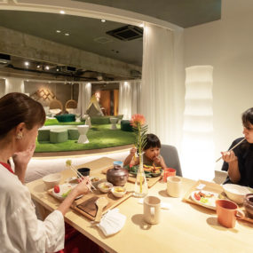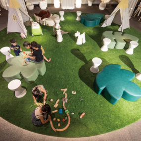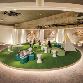 子育てとコミュニティーをより良く両立したいママを対象としたファミリースポットがOPEN!インドアガーデンをイメージしたダイニングホールの中央には、人工芝が敷かれた円形のプレイスポットがあり、積み木などの貸出アイテムで遊ぶことができる。それを包み込むように8つの半個室が設けられ、ダイニングシートタイプやソファシートタイプなど客席のデザインもさまざま。親子連れでも気兼ねなく過ごせる空間へ遊びにいってみて。