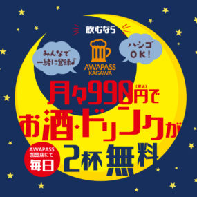AWAPASSは、会員登録し加盟店に行けば、お酒やソフトドリンクが毎日2杯!無料で楽しめる「ちょい飲み支援」のアプリサービス。月々990円で、とってもお得に楽しめるお酒のサブスク!ハシゴもOK!みんなで一緒に登録しよう♪