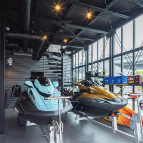 大きなガラスに面した開放的なガレージ空間に、お気に入りのギアを並べて演出。休日はここで仲間たちと集う、遊びの前線基地としても活躍!