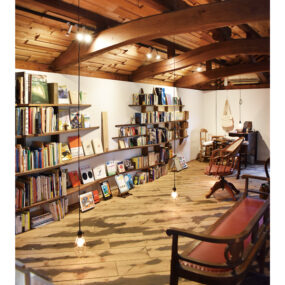 建築士・長田慶太さんの“思いつき”から始まったプロジェクト。子どもも大人も画面(直接光)から情報を得る現代は、紙などの間接光から情報を得る機会が減少。ますます画面から情報を得る世界に間接光から情報を得る場も大切なのではと考えた長田さんは、そのツールとして“本”に辿り着いたそう。3本の木をイメージした本棚、境界線を生み出す低い照明や建物に合わせた家具が作りあげる空間は、どこを切り取っても絵になる。長い時を巡ってきた古書を手にし、忙しない情報社会から立ち止まってゆったりと流れる時に身を任せて過ごしてみて。
