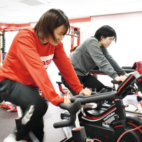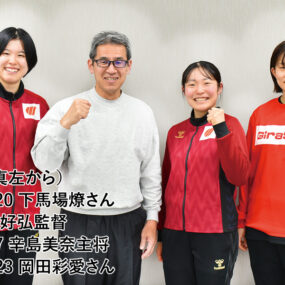 写真や映像では伝わりきらない迫力をぜひ会場に来て体感してください!応援よろしくお願いします!左からNo.20 下馬場燎さん、亀井好弘監督、No.7 辛島美奈主将、No.23 岡田彩愛さん(画像7枚目)