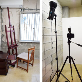 (左)アトリエメンバー限定でいつでも自由に使える制作スペース。画材や制作途中の作品は「アート庫」で丁寧に保管するので、手ぶらでふらっと立ち寄れる。