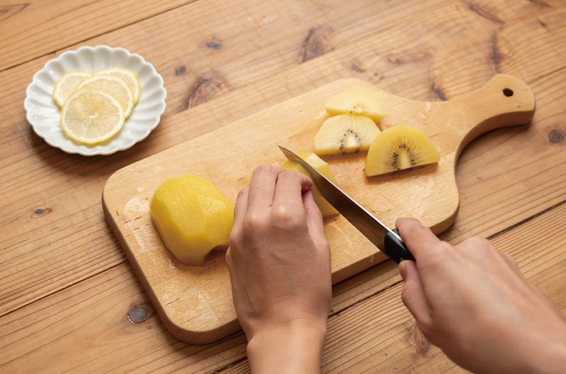(1)レモンは皮付きのまま輪切り、キウイフルーツは皮を剥いて半月切りにする。