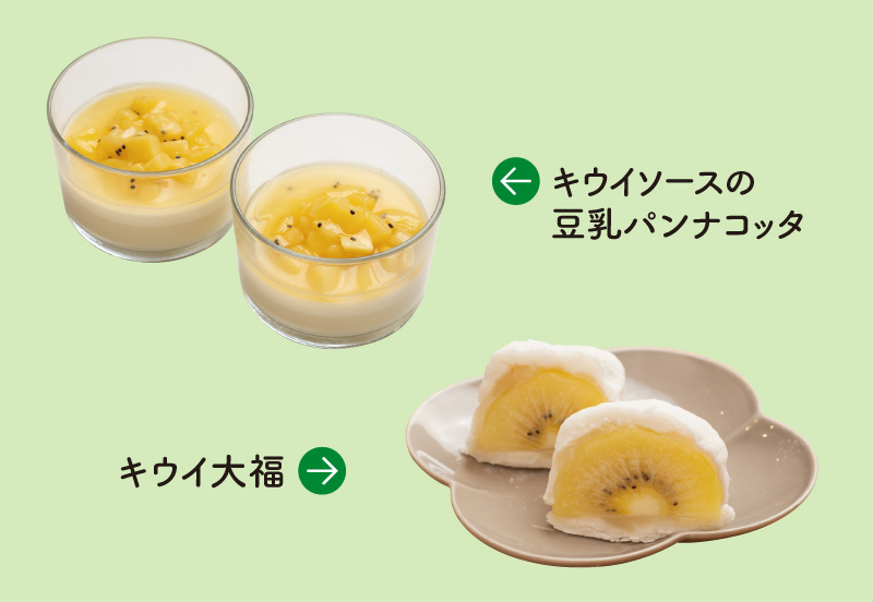 無調整豆乳・生クリーム・粉ゼラチン・砂糖で作る、とろとろ食感のパンナコッタに、キウイフルーツソースをかけた一品。