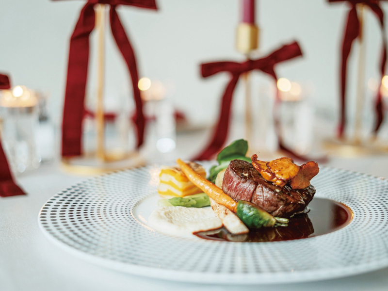 フレンチならではのソースで多彩な味わいを表現したクリスマスディナー。今年はヨーロッパの野菜やフランスの食材をベースに、シェフが一皿一皿丁寧に仕上げる。オープンキッチンから漂う芳醇な香りに誘われ、口に広がる奥深い味わいが、幸せな気持ちで満たしてくれる。ソースの趣向や素材の旨味が溶け合い、特別な夜にふさわしい華やかさと豊かさを届けてくれる。