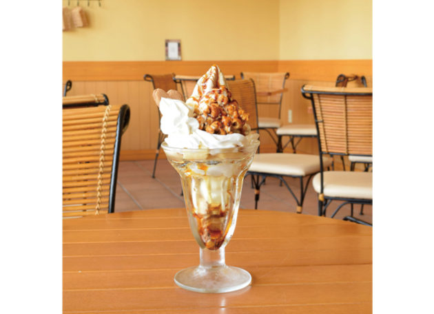 コーヒー風味のソフトクリームにキャラメルソースとポップコーンをトッピング。ソフトクリームは牛乳ソフトに変更可能!