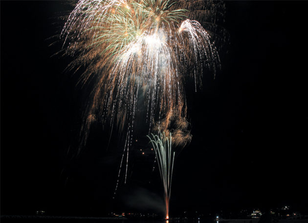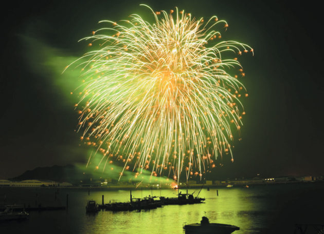 瀬戸内海のバックを舞台に頭上に打ち上がる百花繚乱の花火に魅了されよう