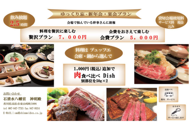 1300年の歴史が紡ぐ由緒ある石清水八幡宮にある「神明殿」から、ゆっくりと美味しいお料理をいただきながら、楽しい忘・新年会、宴会プランの登場!料理を贅沢に楽しむ〔贅沢プラン〕、会費をおさえて楽しむ〔会費プラン〕メインメニューは「選べるお料理(ビュッフェ・会席・鍋)」。飲み放題は2.5時間。カラオケ、県内の送迎もサービス・・。ぜひ気軽に予算などご相談を。~Information~