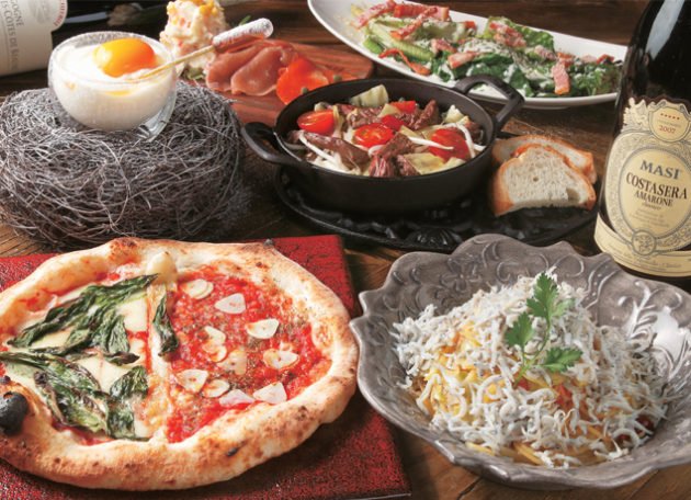 ・前菜3種盛り合わせ ・石窯焼きのシーザーサラダ ・牛すじ肉のアヒージョ ・2種類のピッツア ・名物!!しらすのペペロンチーノ ・鳥の巣プリン