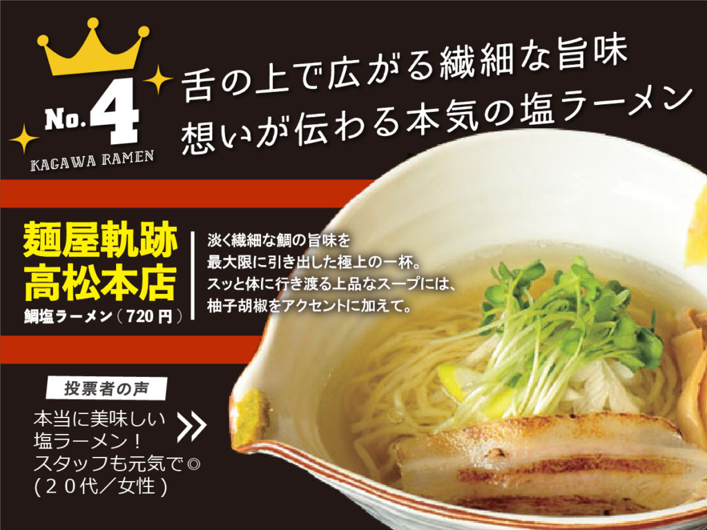 4位にランクインしたのは、繊細な旨味を楽しめる塩ラーメン専門店 麺屋軌跡 高松本店!