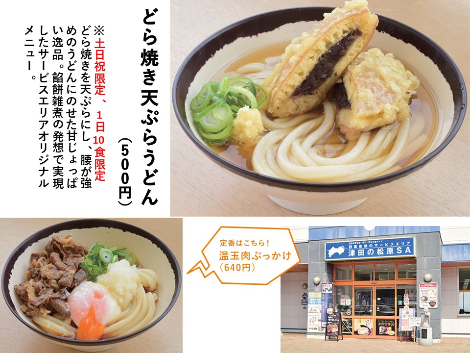 面白く、意外性のあるうどんメニューが随時登場するサービスエリア。どら焼き天ぷらは別皿で提供するため、サクサクの衣のどら焼きとダシに染みたどら焼きの両方を味わうことができる。販売中の「まかないうどん」は人気メニューがレギュラーメニューとなったイチオシの一杯。