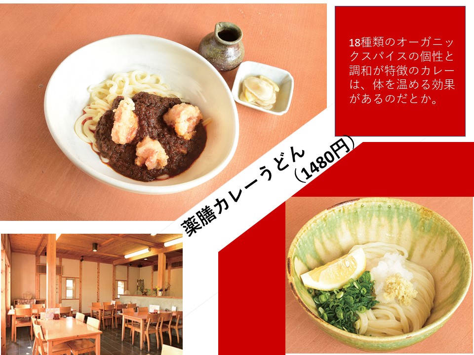 3月より販売を開始した「薬膳カレー」がすでに評判を集め話題のお店。北海道産小麦100%の手打ち麺にダシを少しずつかけながら、味の変化を楽しみつつ最後にライスを加えるのもおすすめ。オーガニックスパイスを使用した「薬膳カレー」で心も体も元気になろう。
