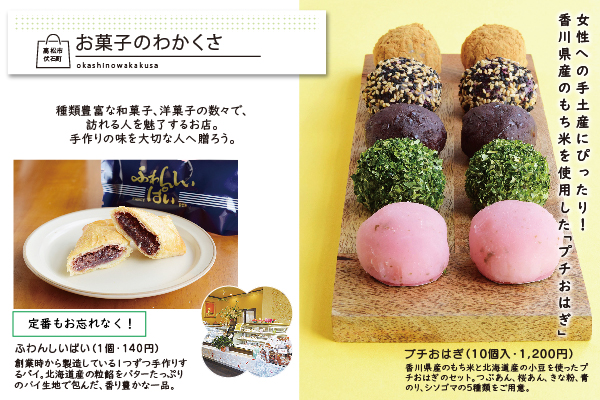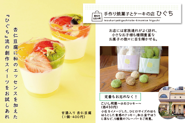 地元の素材を使った個性豊かな和洋菓子を販売し、選ぶ楽しさがあると評判の『ひぐち』。香川県や地元・仏生山にゆかりのある和洋菓子は手土産にぴったり。また行事ごとにインパクトのあるユニークなお菓子を販売しているのでそちらも注目!店長おすすめの濃厚な味わいでワインにも合う「バスクチーズケーキ」も1度試してみて。