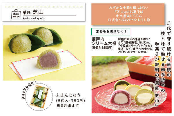 粒餡と地元の藻塩を練りこんだ「讃岐藻塩」をはじめ、「小豆島オリーブ」や「さぬき桑茶」など、瀬戸内の素材にこだわったクリーム大福。