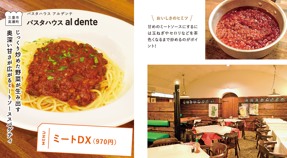 三豊で31年間愛されるパスタハウス。ミートソースのパスタにはオープン当初から提供している「ミートDX」以外にもベーコンが入った「ミートスパゲティ」や生パスタの「ミートソーススパゲティ」をご用意。モダンで落ち着いた大人のムードも感じられる空間なので、おしゃれなディナーにも最適。