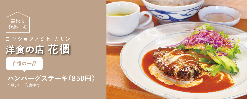 香川の洋食文化を語るうえで欠かせない『コトデンホテル』のレストランで18才から働き始め、60年近く料理人の道を歩んできた櫛田さん。『花櫚』を開いた理由の1つでもある「気軽に洋食を楽しんでもらいたい」という想いから、すべて手作りにこだわった本格的なメニューを手頃な価格で提供している。カウンター越しに見える熟練の技に目を奪われ、美味しい香りに誘われた後に極上の逸品を堪能できる至福のひと時を、存分に味わって。