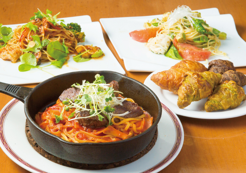 定番はもちろん、旬の素材を使った季節限定のパスタが大人気!今ならスタミナな満点のガッツリ肉がのったナポリタンや、旬の鱧を使った夏限定メニューを楽しめる。新鮮で高品質と話題の「小豆島・島鱧」を使った冷製パスタはさっぱりして美味しいと評判!ランチ、ディナーともにパスタやピザ、リゾットなどのメインを一品選ぶと地元の農家や青果店から仕入れた新鮮サラダバーや香ばしい風味と、外はサクサク、中はふんわり食感が魅力の焼き立てクロワッサンなどが楽しめるうれしいビュッフェ付き。