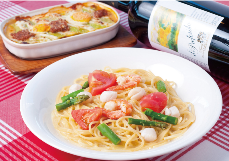 アスパラギ(1,200円) トマト、エビ、アスパラ、ホタテのクリームソース。