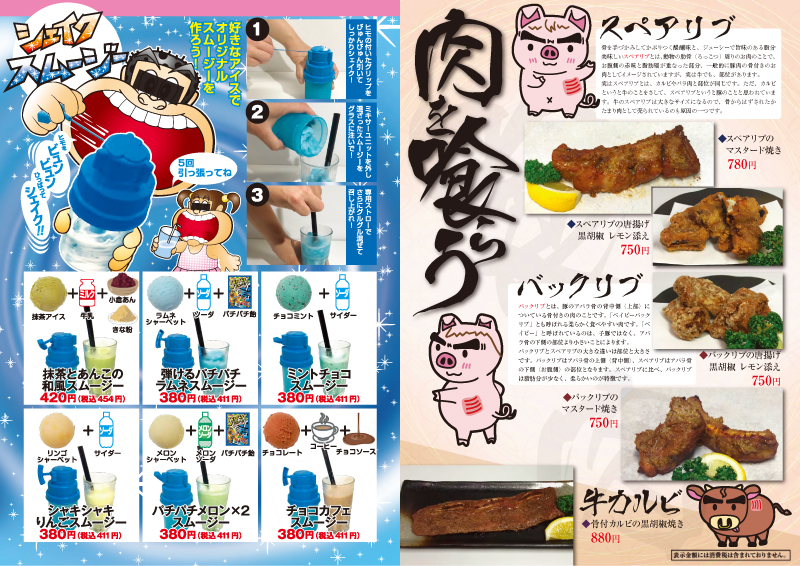 『鳥匠』では暑い夏を吹き飛ばしてくれる2つのイベント実施中!!夏といえばやっぱり“肉”。肉好きならば決してはずすことのできないスペアリブや牛カルビなどなどこだわり肉メニューが勢ぞろい!! また最後の〆デザートにはシェイクスムージー!!例えばチョコミントとサイダーでミントチョコスムージー(380円)。好きなアイスを選んでオリジナルのスムージーを作ってみませんか?今年の夏は美味しいだけじゃなく、楽しいや可愛いが満載の『鳥匠』から目が離せない!