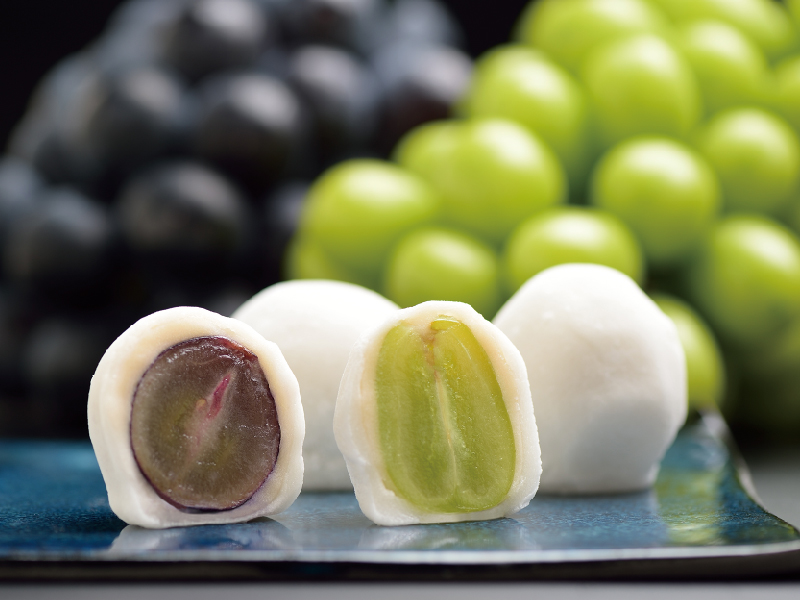 新鮮でみずみずしいぶどうたちをそのまま大福に仕上げました。自社農園で摂れるブラックビートは大粒で味も濃く、大福との相性も抜群です。