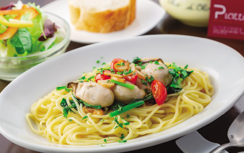 牡蠣のパスタは、具材やソースが週替わり。(平日ランチでもセットで1,300円)