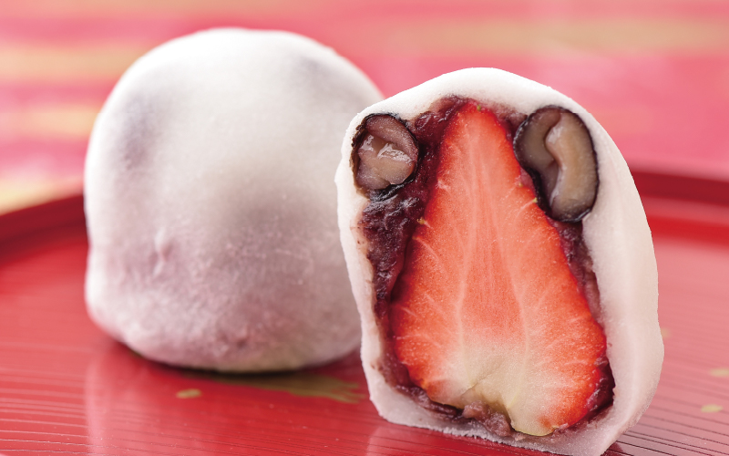 古来より赤は、厄除けの色とされており、赤い大粒いちご、大納言小豆、さらに鬼を払う讃州黒大豆を使って立春の大福に。素材が醸し出す味の三重奏が人気♪
