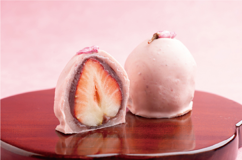 讃岐の大粒いちごをあっさりこし餡で包み、薄紅色の道明寺餅に仕上げています。いちごの味わいと塩漬け桜葉の香りが奏でるハーモニーは想像を超える美味しさ。