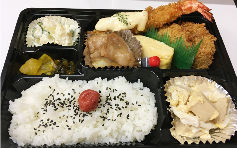 ぷりぷりエビフライやジューシーなメンチカツ、ご飯が進む生姜焼きと優しい味の出汁巻きタマゴなど、お店の人気メニュー達を豪華に限定ミックス。日頃、お店では中々味わえないような夢の詰め合わせが嬉しいお弁当。