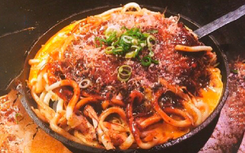 釜玉うどんと骨付き鶏をミックスした丸亀焼は、親鳥のクセになる歯応えと、釜玉のまろやかさがマッチした人気メニュー。〝丸亀〟を贅沢に味わえるこのお好み焼きは、ボリューム満点で家族とシェアして楽めるのも嬉しい。