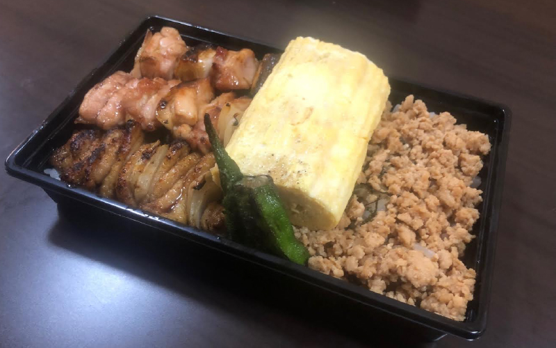 備長炭で焼いた炭火の風味が香る「ネギマ、せせり、皮」が魅力。更に、だし巻きタマゴと鶏そぼろを加えた豪華DXな焼き鳥弁当です。