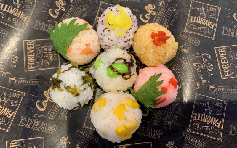 8種の混ぜゴハンおにぎりは〝鶏そぼろと大葉〟をはじめ高菜明太子や枝豆塩昆布、焼きとうもろこしやシャケなど盛り沢山。なかでも天かすネギ入りの〝たぬきむすび〟は新鮮。「こだわり麺や」特製のかえし醤油の風味も味わうことができるお弁当。