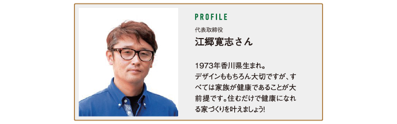 健康で安心な暮らしには自然素材が不可欠。『江郷建設』では日本の気候風土にあった“呼吸する家づくり”をベースに、断熱や素材にこだわり有害物質を排除した医師が薦める本物の健康住宅「0宣言の家」を提供しています。医師監修のエビデンスを基に、健康に良い影響を与える様々なデータを取得しています。さらに目に見えない土台や柱の構造まで国産の天然無垢材を使用しているほか、調湿性に優れたクアトロ断熱によって体感温度が一定に保たれた快適な空間は夏涼しく冬暖かな住環境を叶えます。このように厳選した自然素材と厳格な基準を満たす工法にこだわることで、家族の健康を守り、永く心地よく過ごせるよう、一つひとつ丁寧に、真摯な心で家づくりに向き合っていきます。『江郷建設』は夫婦で営む工務店です。身近な相談役として、家づくりのお悩みなど気軽にご相談ください。