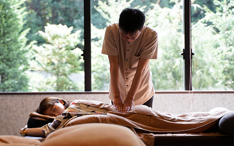 窓の外に緑を臨み、リゾート気分を味わいながら体をもみほぐしてくれるボディケア施設『Rakura』。