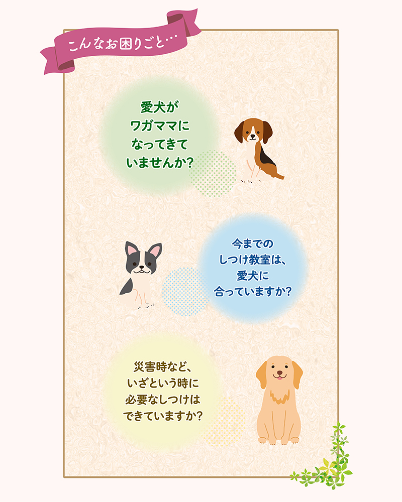 犬のしつけは「人と犬が幸せに暮らすため」に必要なもの。犬を迎えたとき、人と犬が幸せに暮らすためには、犬のしつけが必要です。犬のしつけを行うか行わないかで、家族の生活スタイルが大きく変わることもあります。しつけをせずにただかわいがるだけでは、人間も犬も不幸になってしまうことがあります。愛犬が周囲の人に迷惑をかけず、人と快適に暮らせるようになるために、生活上のルールを教えてあげるのが「犬のしつけ」です。犬のしつけは、犬と飼い主さんを守り、他者へ配慮する為のもの!お利口な犬に芸を教えるのではなく家庭犬として命を全うする為の訓練を行っているのが『dog training犬寺子屋』。