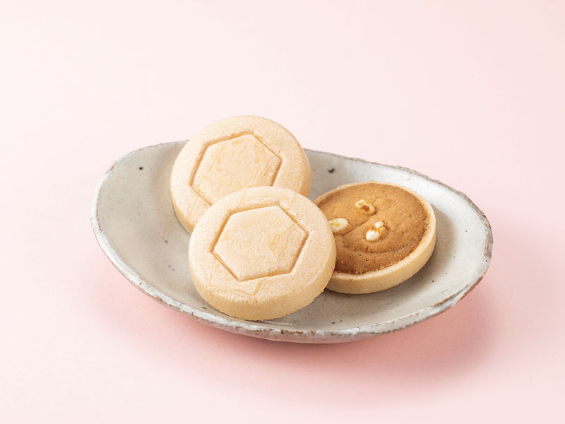 丸亀にちなみ、亀の甲羅をイメージした最中種においでまいの米粉を使ったサブレを合わせたお菓子。サクサクと香ばしい2つの美味しさを1度に楽しめる。紅白の化粧箱入りで引出物やお祝い事の進物などにもおすすめ。 ●1個110円、8個入1,000円