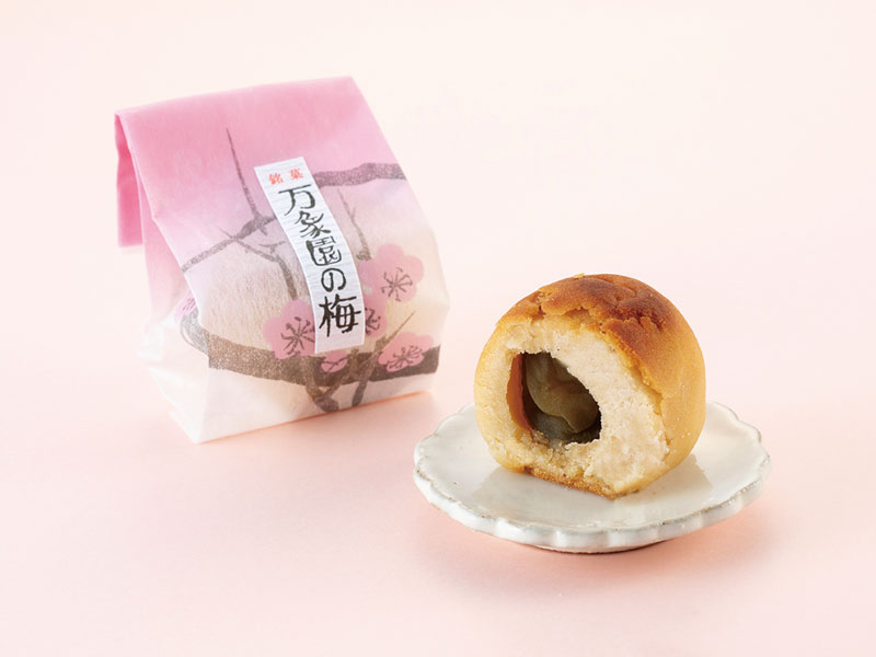 『万象園』の銘菓を作っている唯一のお店。桃山生地と白あんで蜜漬の梅をまるごと包みました。梅の実の酸味とあんの甘さ、生地のバランスが絶妙!さっぱりとした上品な味を楽しんで。●1個162円