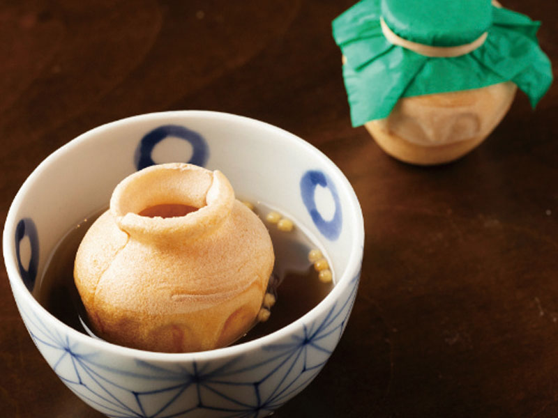 包み紙を外してうつわに入れ、熱湯をかけるだけで美味しいおしるこの出来あがり。パリッからもちもち、とろとろと変化していく最中種と豊かな餡の風味を堪能して。●1個216円 ※冬季限定