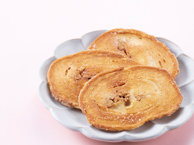 薄く伸ばしたパイ生地にクルミをのせて手作業で一折一折丁寧に巻いた、どこか懐かしいパイ。ひと口ごとにふんだんに織り込んだバターの香りが広がる贅沢な美味しさにファンも多い『かまど』の人気商品の1つ。 ●5枚入570円