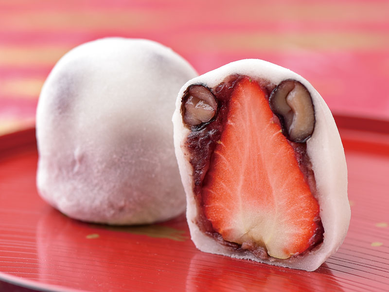 古来より赤は「厄除の色」とされており、赤い大粒いちご、大納言小豆、さらに鬼を払う讃州大黒大豆を使って立春の大福に仕上げています。素材が醸し出す味の三重奏が人気です。