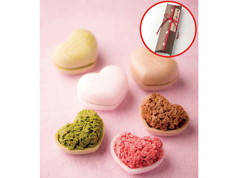 サクサクのクーベルチョコのクランチを可愛らしいハートの最中で合わせました。 抹茶・いちご・チョコ、それぞれの素材の味をお楽しみください。