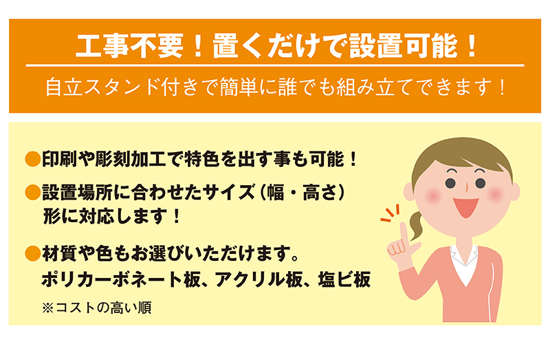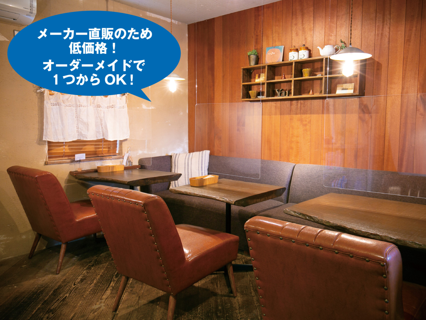 飛沫による感染リスクを低減する飛沫感染防止パーティション。飲食店、会議室、販売店、美容室、クリニック、学校、教室、塾など。様々な場面で、飛沫感染を防ぐアクリルパーテーションをご提案いたします!『南海化工株式会社』では、メーカー直販のため低価格!オーダーメイドで1つからOK! いろんなタイプのパーテーションを設置場所に合わせたサイズ(高さ・幅)で作れるので、気軽にご相談を。材質や色も選べます! 印刷や彫刻加工で特色を出すこと可能♪