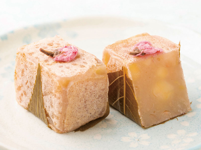 白いんげん豆の粒餡に葉を入れた「栗きんつば」に、桜風味の衣を付けて六面を丁寧に焼き上げています。仕上げは桜餅と同じく桜葉と桜の花をあしらっています。馥郁とした味わいが自慢です。