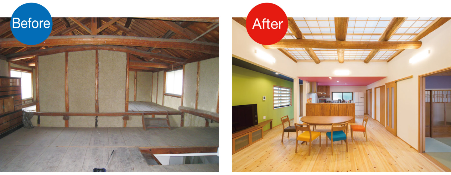 子どもたちの成長に合わせて変化するライフスタイルを見越し、今後も快適に住まえるようリノベーション。築70年の家を支える桁はなんと約15mの立派な一本杉。こうした梁や天井板、建具などこの家とともに生きてきたものを残しながらも、断熱性や耐震性、間取り を見直し、現代的な機能性を備えた住まいに生まれ変わりました。