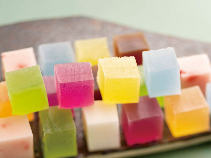 外は"シャリシャリ"中は“ツルッ”とした柚子、ラズベリー、ペパーミント、メロン、ブルーベリー、珈琲、柑橘の「琥珀ゼリー」。フォンダンを寒天で仕上げた、いちご、桃の「寒氷」。9種類の可愛いキューブ状の琥珀羹をセットにしました・古代山城「屋嶋城」に見立てて名付けました。少しずつ楽しみながらどうぞ。
