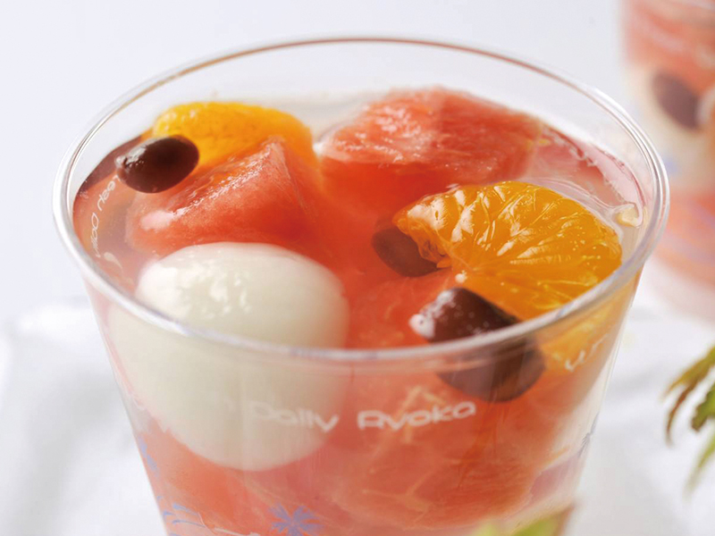 フレッシュすいかのほとばしる旨味がみずみずしいゼリーと共に口の中にひろがります。白玉、あずき、みかんも一緒にどうぞ。