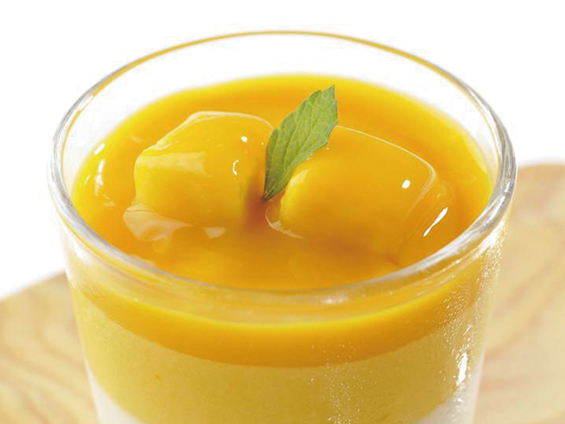やわらかな杏仁プリンの中には「丹波大納言の鹿の子豆」を入れて、上には 濃厚でトロピカルなマンゴーのプリンを合わせています。さらに マンゴーの果肉ピューレを乗せて、贅沢な夏のデザートに仕上げています。