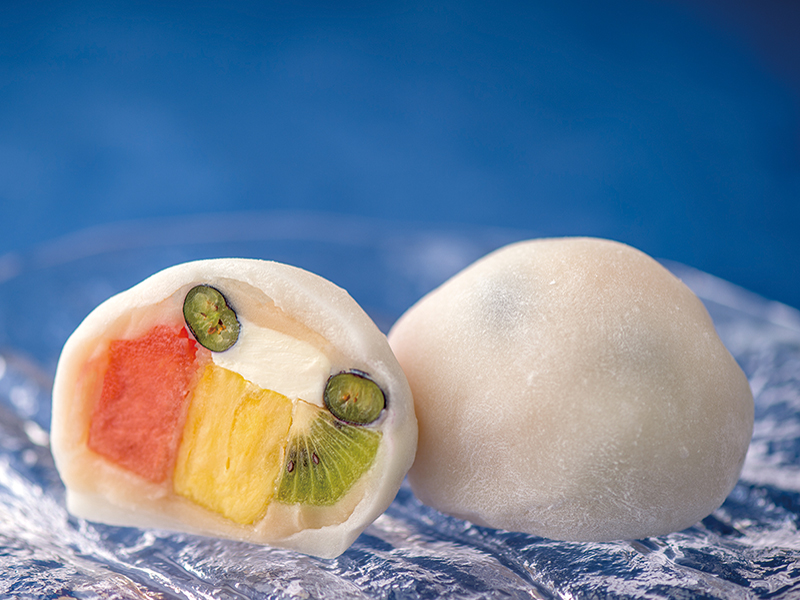 すいか、パイナップル、ブルーベリー、キウイの4つのフルーツに濃厚クリームチーズをのせて大福餅に仕上げています。フルーツが豊富な「夏」限定の味わいをどうぞ。