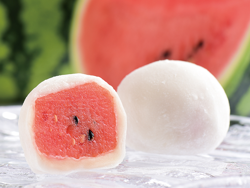 甘く冷えた完熟のスイカを角切りにして白餡で包み、そのままフレッシュ大福にしました。スイカのしたたる果汁と大福の相性は抜群で想像を越えた美味しさです。