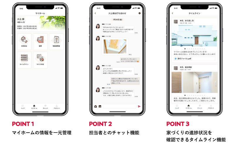 打ち合わせの度にアップデートする図面や仕様書・資金計画など、マイホームづくりのスタートと共に必要となるのがたくさんの情報管理。これまでは書類でやり取りしていたこれらの情報をスマホのアプリで一括管理できるのがマイホームアプリ「myhm(マイホム)」です。情報の管理だけでなく、チャット機能での家づくりの進捗確認や完成後のメンテナンスの案内まで、マイホームにまつわるすべての情報と、暮らしをさらに豊かにしてくれる様々なコンテンツで暮らしを支えます!<!–