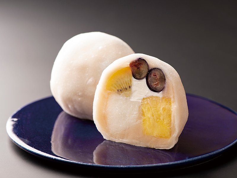 梨・パイナップル・キウイ・ブルーベリーの4種のフルーツにクリームチーズを入れ、ミックス大福に仕上げました。